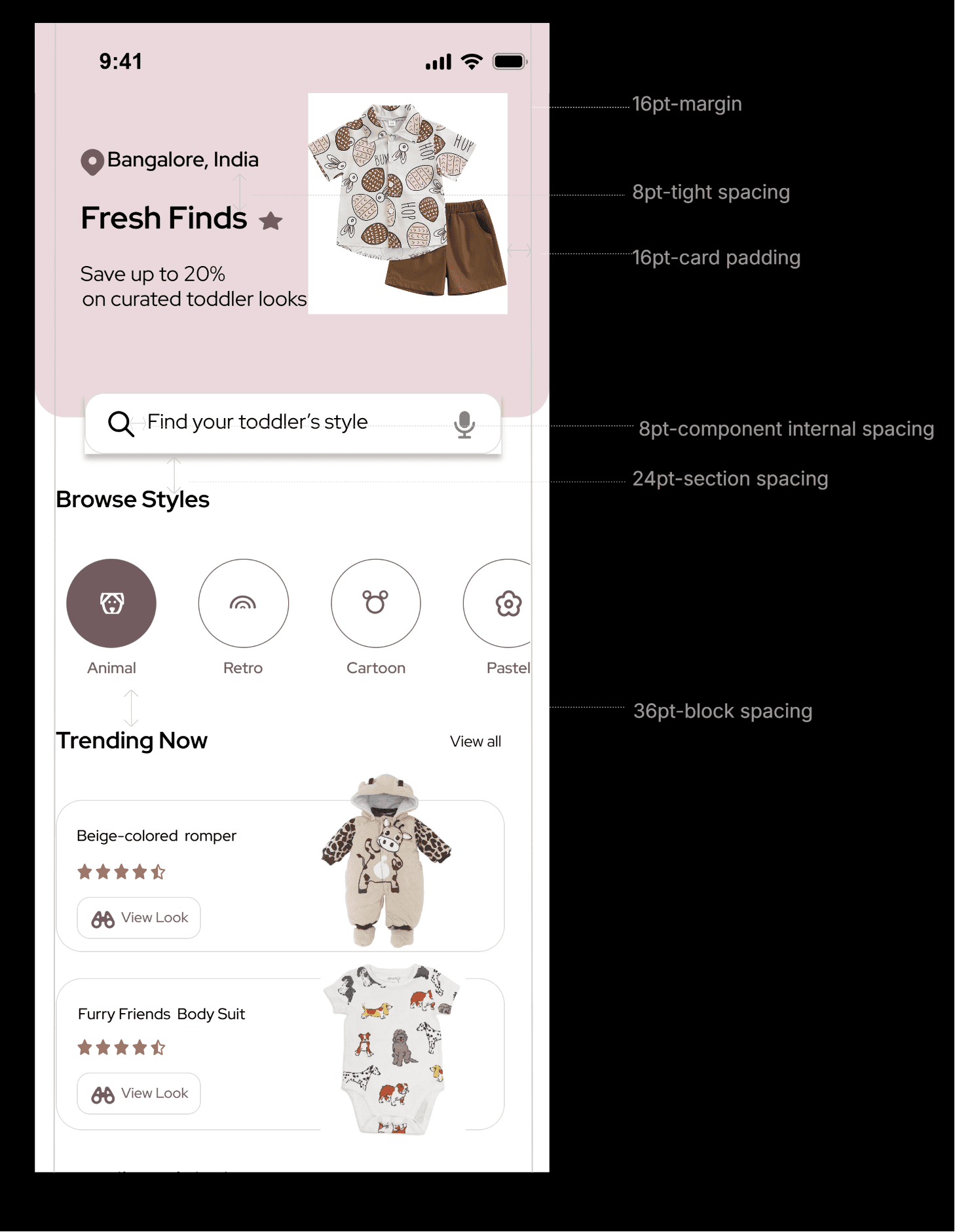 Built on a restrained 4 pt grid and consistent vertical rhythm to maintain readability across mobile layouts.